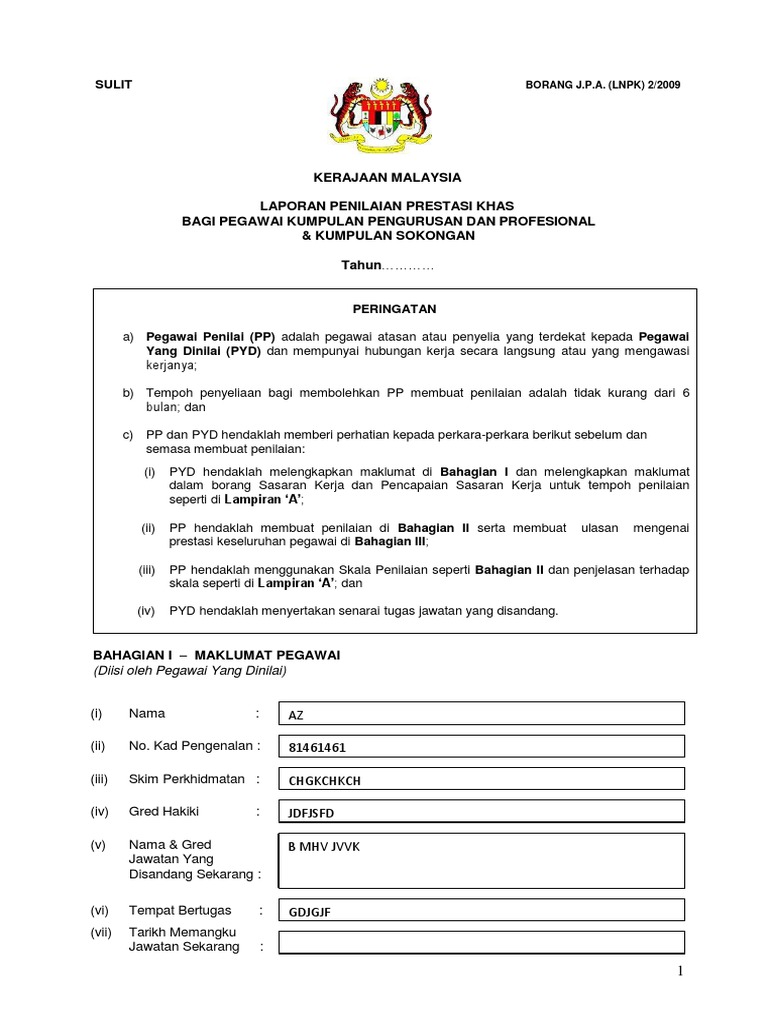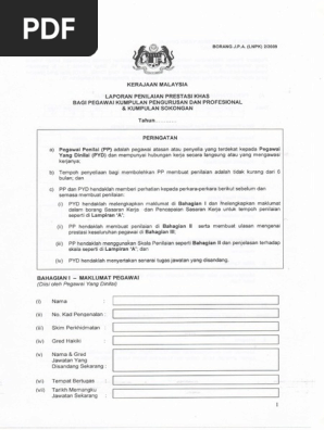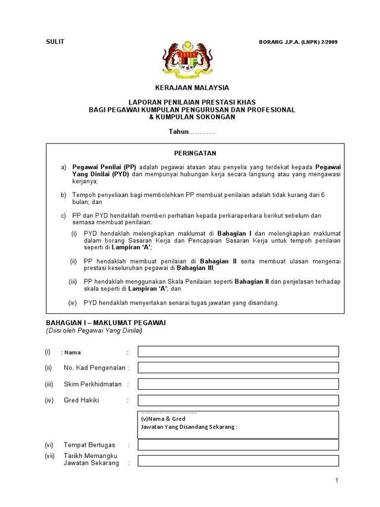 LNPK 22009 P YD hendaklah melengkapkan maklumat di Bahagian I dan melengkapkan maklumat dalam borang Sasaran Kerja dan Pencapaian Sasaran Kerja untuk. Up to 3 cash back BORANG_J_P_A__LNPK_2-2009pdf - Free download as PDF File pdf or read online for free. BAGI PEGAWAI KUMPULAN PENGURUSAN DAN PROFESIONAL.